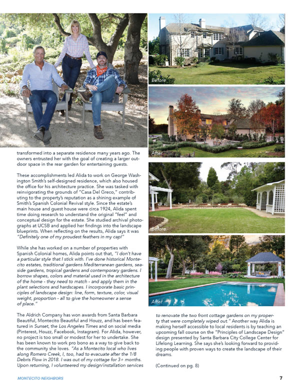 Since first launching her landscape design career in 1982 in Los Angeles, Alida Aldrich has stayed true to three pillars of her craft: respect for a site’s existing landscape; careful consideration of surrounding architecture; and above all, a loyalty to client vision. Throughout Santa Barbara and Montecito — where she relocated her headquarters in 1996 — The Aldrich Company’s time-tested approach is well-suited to the region’s picturesque parcels, architectural review, and homeowners’ sophisticated and discerning taste. And it shows. Aldrich has won design awards from the Montecito Association, Santa Barbara Beautiful, and — four years running — international “Best of Houzz” accolades. Her services include complete conceptual design, full working drawings, installation oversight, and maintenance supervision. For more, visit her site: http://www.aldrich-landscapes.com